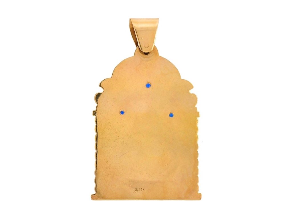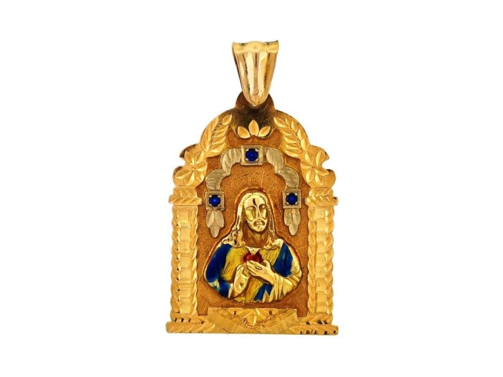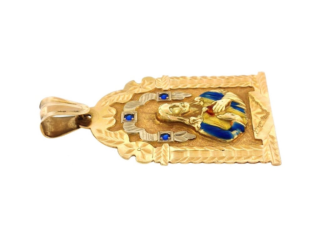 Americká madonka, tzv. domeček. Přívěsek ze žlutého 14. karátového zlata se třemi modrými zirkony a ručně domalovaným Ježíšem Kristem. Model, který se již nedá téměř sehnat. Nádherná práce! Označeno puncem pro 14 karátové zlato "labuť".